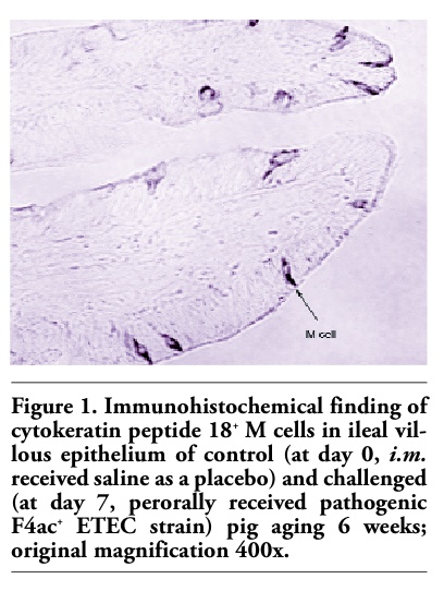 | Figure 1. Immunohistochemical finding of cytokeratin peptide 18+ M cells in ileal villous epithelium of control (at day 0, i.m. received saline as a placebo) and challenged (at day 7, perorally received pathogenic F4ac+ ETEC strain) pig aging 6 weeks; original magnification 400x. |