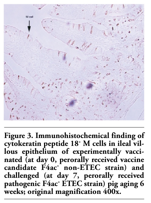 | Figure 3. Immunohistochemical finding of cytokeratin peptide 18+ M cells in ileal villous epithelium of experimentally vaccinated (at day 0, perorally received vaccine candidate F4ac+ non-ETEC strain) and challenged (at day 7, perorally received pathogenic F4ac+ ETEC strain) pig aging 6 weeks; original magnification 400x. |
