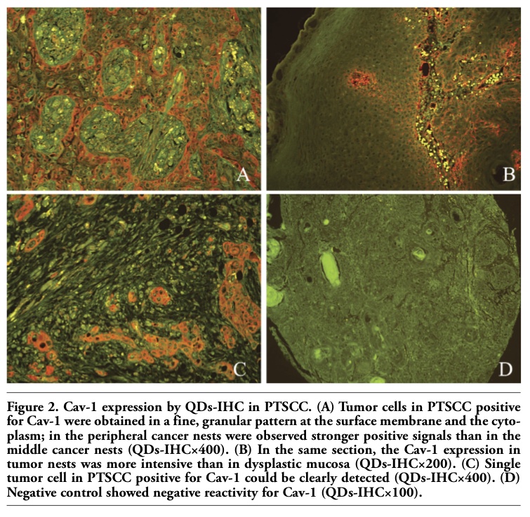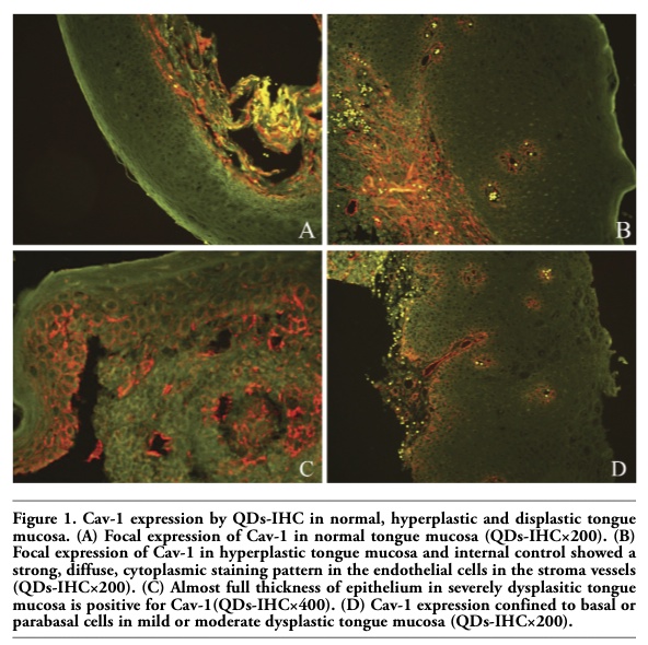 In this report, using a new method QDs-IHC, we sought to investigate the expression of Cav-1 in normal tongue mucosa (NTM), hyperplastic tongue mucosa (HTM), tongue pre-cancer lesions (TPL) and TSCC, trying to elucidate the possible role of Cav-1 in carcinogenesis and development of TSCC.