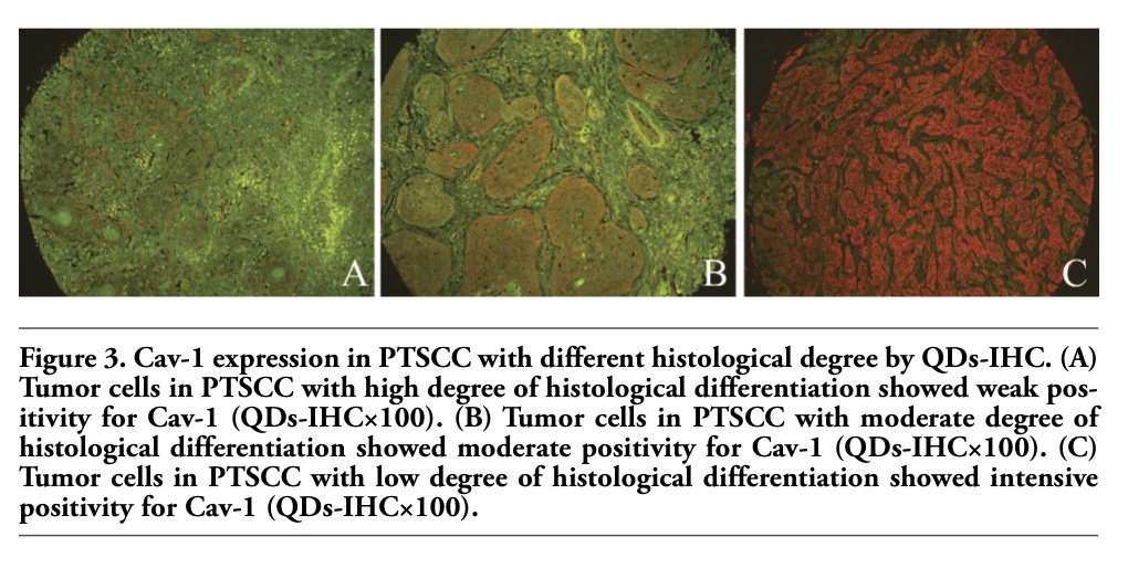 Determination of the expression and spatial distribution of molecular epitopes, or antigens, in patient tissue specimens has substantially improved the pathologist's ability to classify disease processes. Certain tumor pathophysiologies are marked by characteristic increased or decreased expression of some proteins. The primary goals of tumor research are to identify these molecular factors, among which Cav-1 has attracted attention because of its altered expression patterns in tumour cells, which contribute to tumorigenesis and tumor progression. In this report, we have used a new QDs-IHC method to observe the expression of Cav-1 in stepwise carcinogenesis and development of TSCC on basic fluorescence microscope.