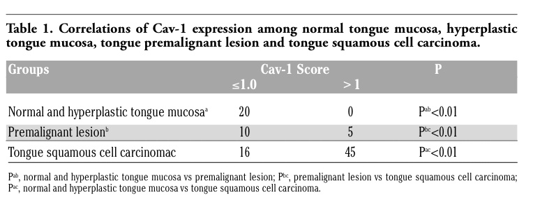 | Table 1. Correlations of Cav-1 expression among normal tongue mucosa, hyperplastic tongue mucosa, tongue premalignant lesion and tongue squamous cell carcinoma. |