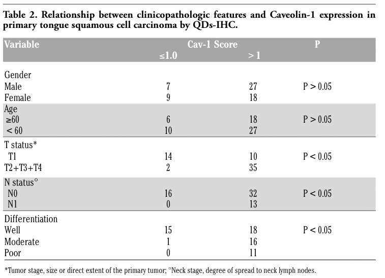| Table 2. Relationship between clinicopathologic features and Caveolin-1 expression in primary tongue squamous cell carcinoma by QDs-IHC. |