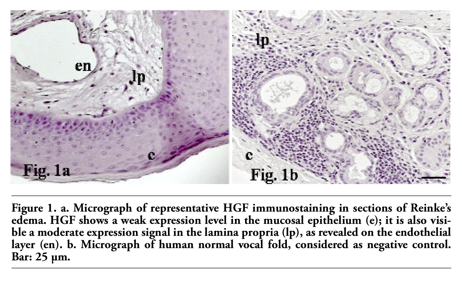 | Figure 1. a. Micrograph of representative HGF immunostaining in sections of Reinke’s edema. HGF shows a weak expression level in the mucosal epithelium (e); it is also visible a moderate expression signal in the lamina propria (lp), as revealed on the endothelial layer (en). b. Micrograph of human normal vocal fold, considered as negative control. Bar: 25 µm. |
