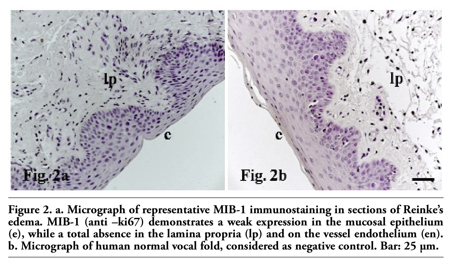 | Figure 2. a. Micrograph of representative MIB-1 immunostaining in sections of Reinke’s edema. MIB-1 (anti –ki67) demonstrates a weak expression in the mucosal epithelium (e), while a total absence in the lamina propria (lp) and on the vessel endothelium (en). b. Micrograph of human normal vocal fold, considered as negative control. Bar: 25 µm. |