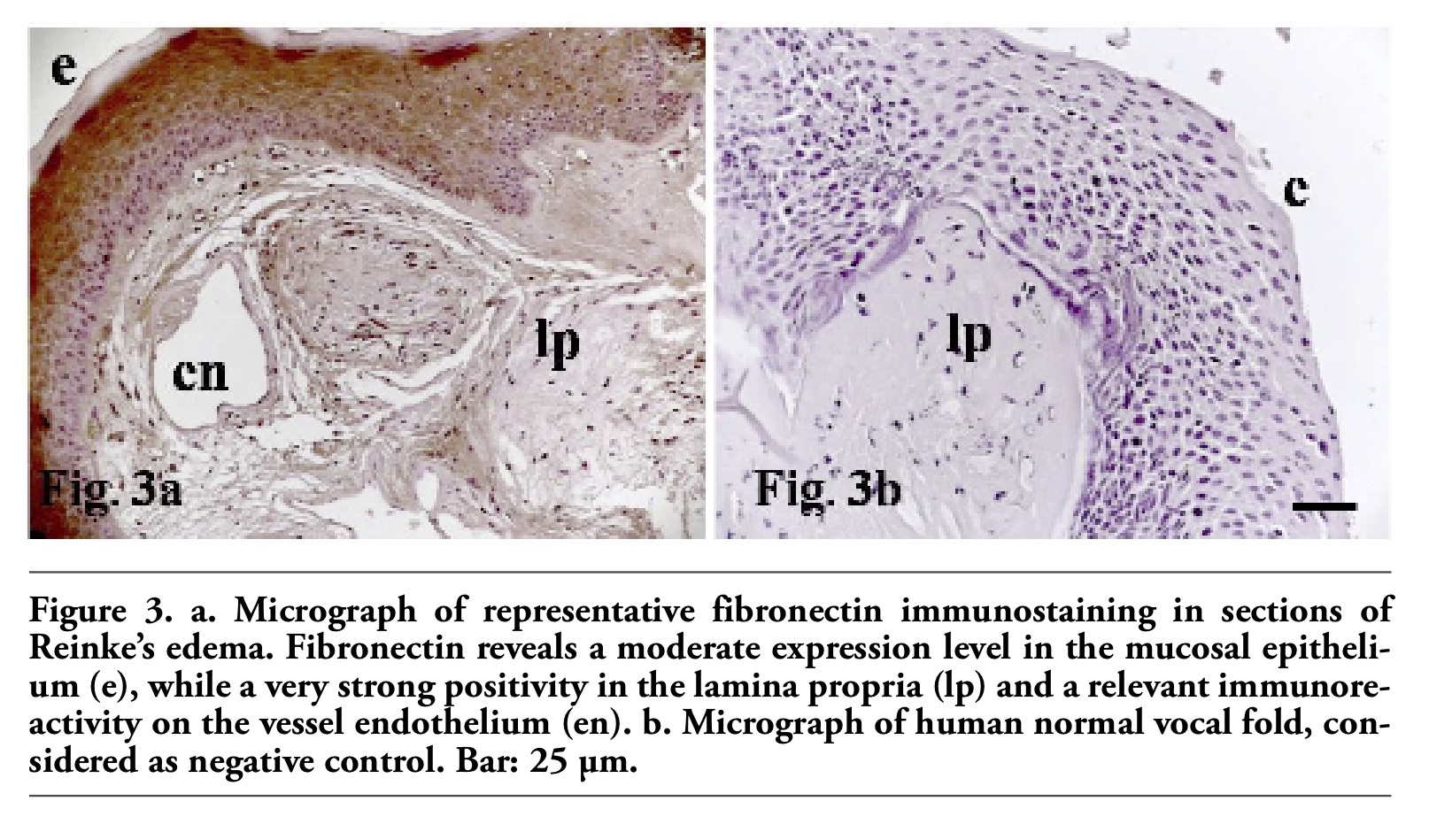 | Figure 3. a. Micrograph of representative fibronectin immunostaining in sections of Reinke’s edema. Fibronectin reveals a moderate expression level in the mucosal epithelium (e), while a very strong positivity in the lamina propria (lp) and a relevant immunoreactivity on the vessel endothelium (en). b. Micrograph of human normal vocal fold, considered as negative control. Bar: 25 µm. |