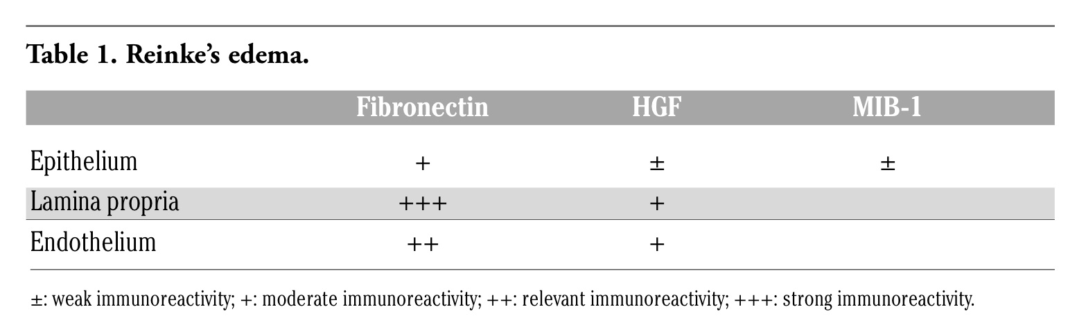 Key words: Reinke’s edema, Ki67, HGF, fibronectin, immunohistochemistry, extracellular matrix.