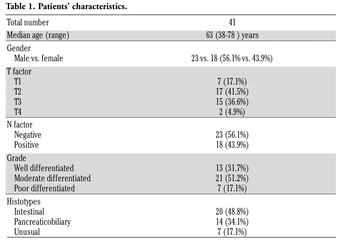 The main clinicopathological features are summarized in Table 1. The cohort consisted of 41 patients with pathological diagnosis of radically resected cancer of the ampulla (23 men and 18 women). The median age at diagnosis was 63 years (range 38-78). Seven patients (17.1%) were classified as T1, 17 (41.5%) as T2, 15 (36.6%) as T3, and 2 (4.9%) as T4. Eighteen (43.9%) patients had locoregional lymph node metastasis. A positive statistical correlation was found between T and N factor (r=0.507; P=0.001).