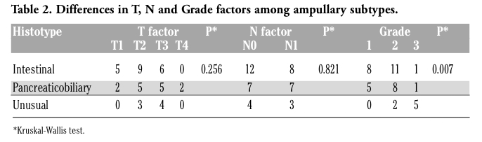 | Table 2. Differences in T, N and Grade factors among ampullary subtypes. |