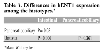 | Table 3. Differences in hENT1 expression among the histotypes.* |
