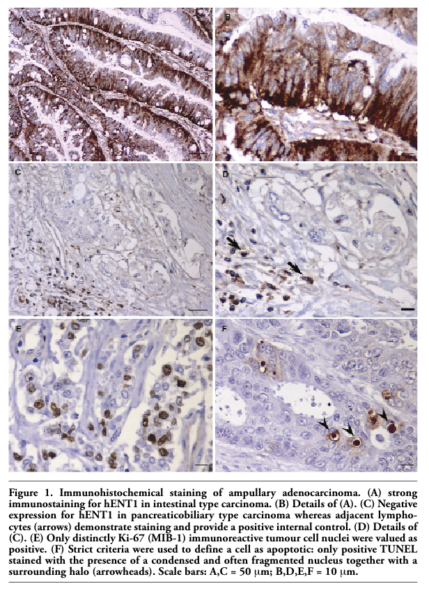 | Figure 1. Immunohistochemical staining of ampullary adenocarcinoma. (A) strong immunostaining for hENT1 in intestinal type carcinoma. (B) Details of (A). (C) Negative expression for hENT1 in pancreaticobiliary type carcinoma whereas adjacent lymphocytes (arrows) demonstrate staining and provide a positive internal control. (D) Details of (C). (E) Only distinctly Ki-67 (MIB-1) immunoreactive tumour cell nuclei were valued as positive. (F) Strict criteria were used to define a cell as apoptotic: only positive TUNEL stained with the presence of a condensed and often fragmented nucleus together with a surrounding halo (arrowheads). Scale bars: A,C = 50 μm; B,D,E,F = 10 μm. |
