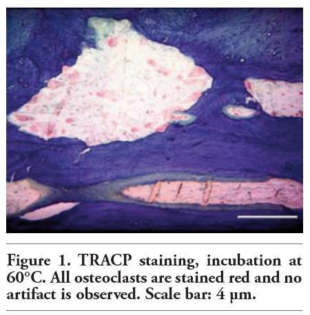| Figure 1. TRACP staining, incubation at 60°C. All osteoclasts are stained red and no artifact is observed. Scale bar: 4 μm. |