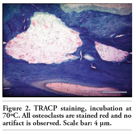 | Figure 2. TRACP staining, incubation at 70ºC. All osteoclasts are stained red and no artifact is observed. Scale bar: 4 μm. |