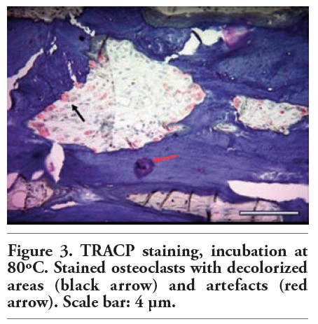 | Figure 3. TRACP staining, incubation at 80ºC. Stained osteoclasts with decolorized areas (black arrow) and artefacts (red arrow). Scale bar: 4 μm. |