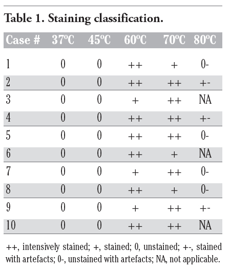 The sections of each biopsy were incubated at different temperatures (37ºC, 45ºC, 60ºC, 70ºC and 80ºC) with the incubation solution in a humid chamber for 30 min.