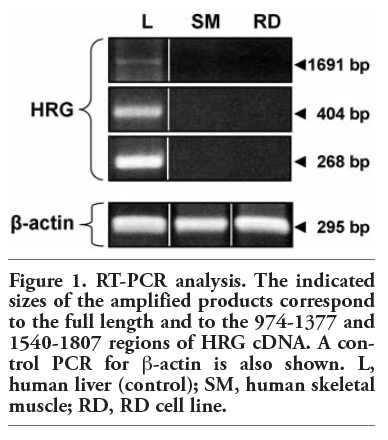 | Figure 1. RT-PCR analysis. The indicated sizes of the amplified products correspond to the full length and to the 974-1377 and 1540-1807 regions of HRG cDNA. A control PCR for β-actin is also shown. L, human liver (control); SM, human skeletal muscle; RD, RD cell line. |
