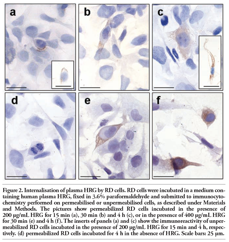 Altogether, the results obtained with permeabilised and unpermeabilised cells give evidence that HRG is internalised by the RD cells.