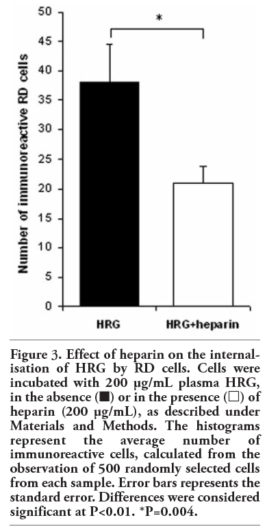 | Figure 3. Effect of heparin on the internalisation of HRG by RD cells. Cells were incubated with 200 μg/mL plasma HRG, in the absence (■ ) or in the presence (□) of heparin (200 μg/mL), as described under Materials and Methods. The histograms represent the average number of immunoreactive cells, calculated from the observation of 500 randomly selected cells from each sample. Error bars represents the standard error. Differences were considered significant at P<0.01. *P=0.004. |