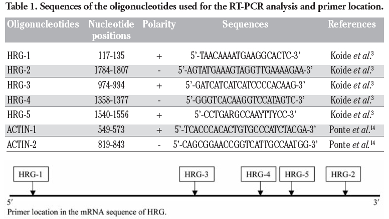 The sequences of the oligonucleotides used for the RT-PCR analysis are reported in Table 1. The paired primers HRG-1/HRG-2 and HRG-3/HRG-4 were used to amplify the full length and the 974-1377 region of the HRG mRNA, corresponding to PCR products of 1691 bp and 404 bp, respectively. The HRG-5 degenerate primer was designed to amplify, together with the HRG-2 primer, a 268 bp fragment corresponding to the mRNA region coding for the sequence recognized by the rabbit anti-HRG antibody that was used in this study.
