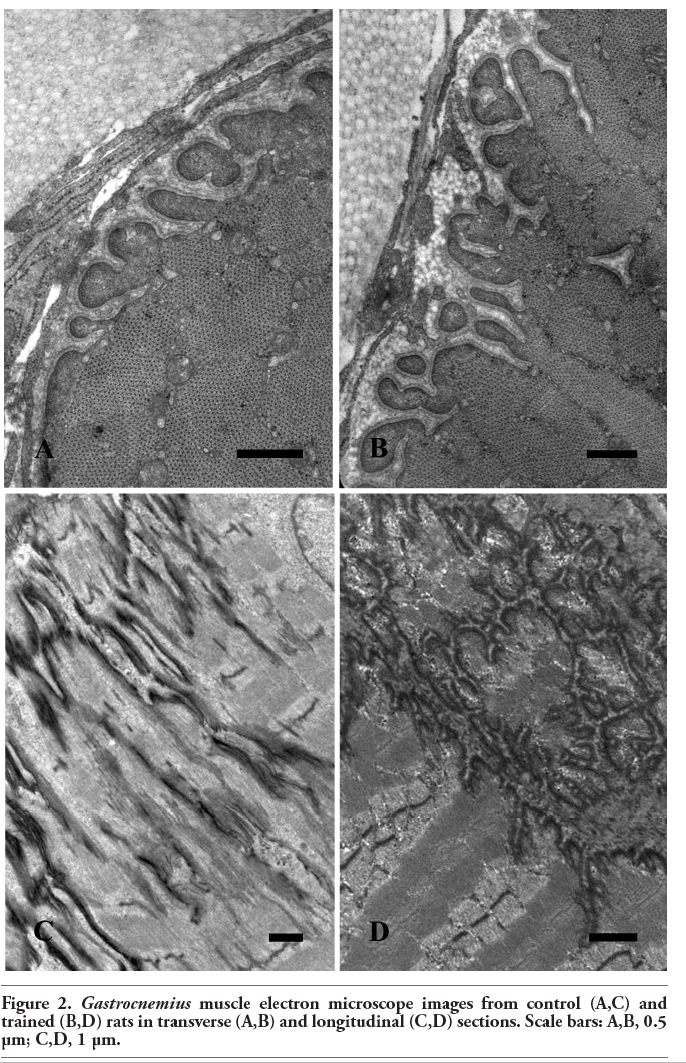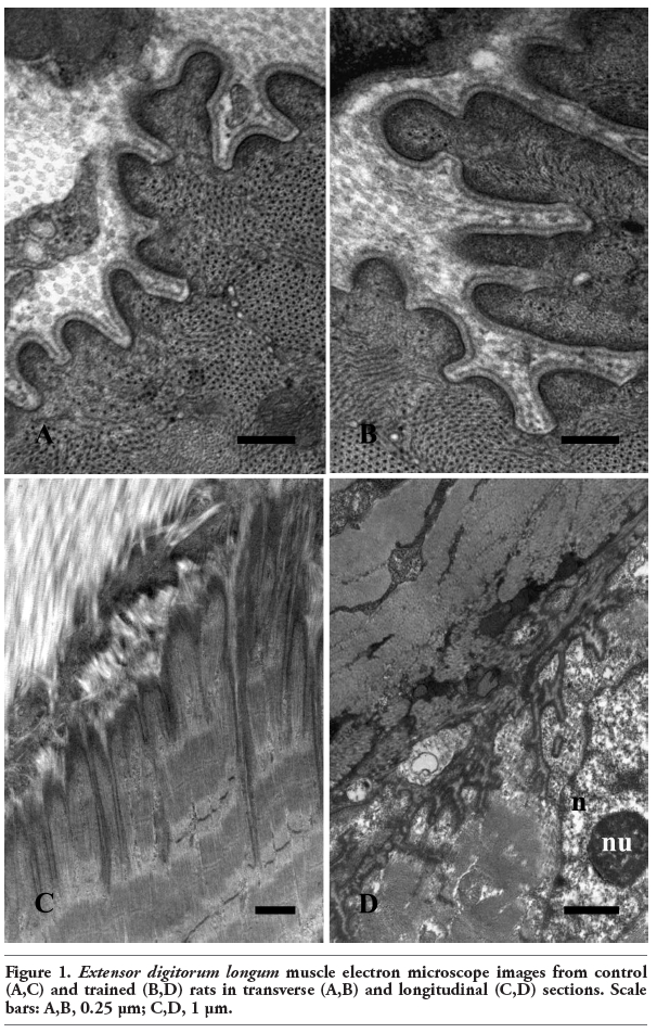 | Figure 1. Extensor digitorum longum muscle electron microscope images from control (A,C) and trained (B,D) rats in transverse (A,B) and longitudinal (C,D) sections. Scale bars: A,B, 0.25 μm; C,D, 1 μm. |