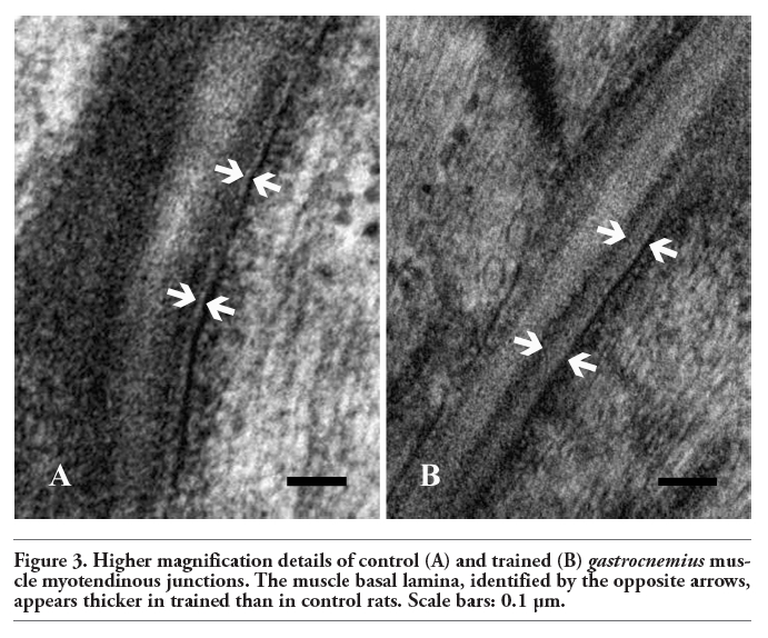 | Figure 3. Higher magnification details of control (A) and trained (B) gastrocnemius muscle myotendinous junctions. The muscle basal lamina, identified by the opposite arrows, appears thicker in trained than in control rats. Scale bars: 0.1 μm. |