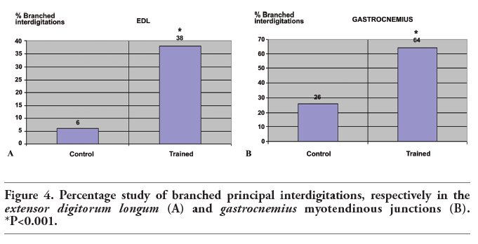 The percentages of the branched interdigitations were 6% and 26% respectively in the EDL and gastrocnemius MTJs of the control group, and 38% and 64% respectively in the trained group (Figure 4). The differences between the control and the trained groups were thus statistically significant (P<0.001).