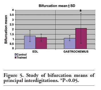 As shown in Figure 5, the bifurcation of the branches occurred (mean±SD) 1.33±0.58 and 1.08±0.28 times respectively in the EDL and the gastrocnemius MTJs of the control group, and 1.16±0.37 and 2.12±1.52 times respectively in the trained group. The difference between the control and the trained group in respect of the gastrocnemius was thus statistically significant (P<0.05).