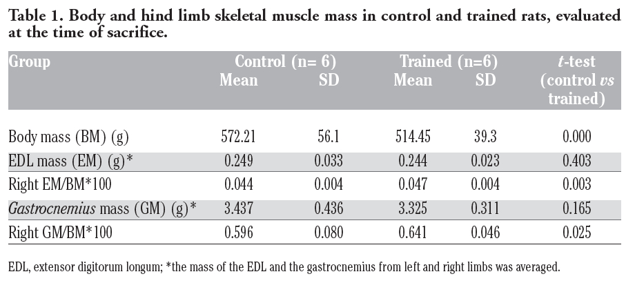 | Table 1. Body and hind limb skeletal muscle mass in control and trained rats, evaluated at the time of sacrifice. |
