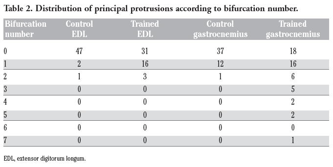 Digitation branching was evaluated by counting the branched principal protrusions and their bifurcations (Table 2). The same number of protrusions (50) was evaluated in the control and the trained muscles.